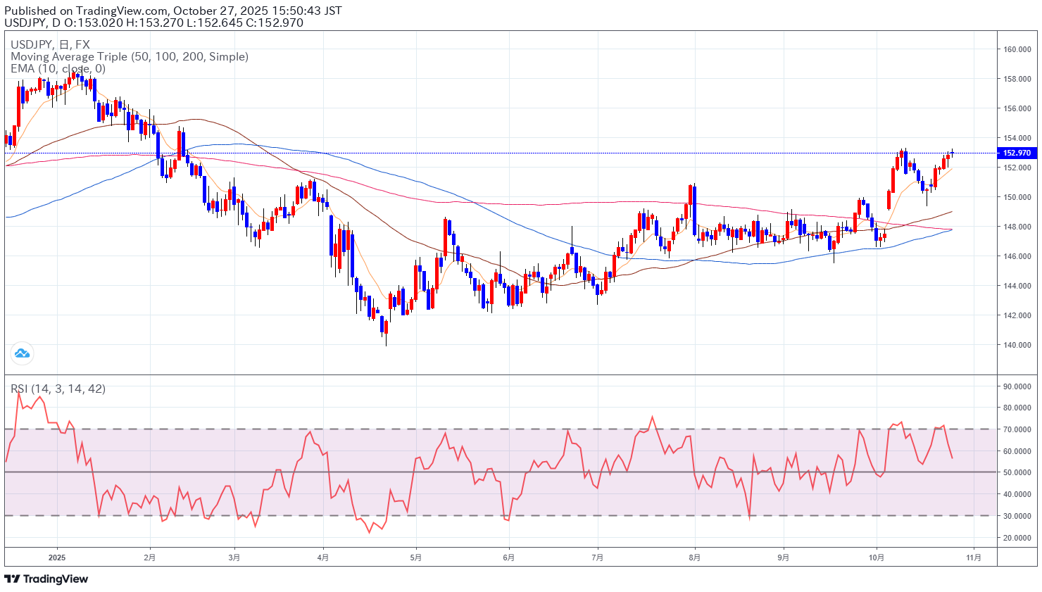 米中首脳会談を前に、米中貿易協議が進展したこともドル買い要因だろう。ベセント米財務長官は26日、マレーシアの首都クアラルンプールで行っていた米中閣僚級協議で「非常に実質的な枠組み」に到達したと明らかにし、トランプ大統領が警告していた中国製品に対する100%追加関税は回避され、中国のレアアース輸出規制が1年延期されることになると述べた。