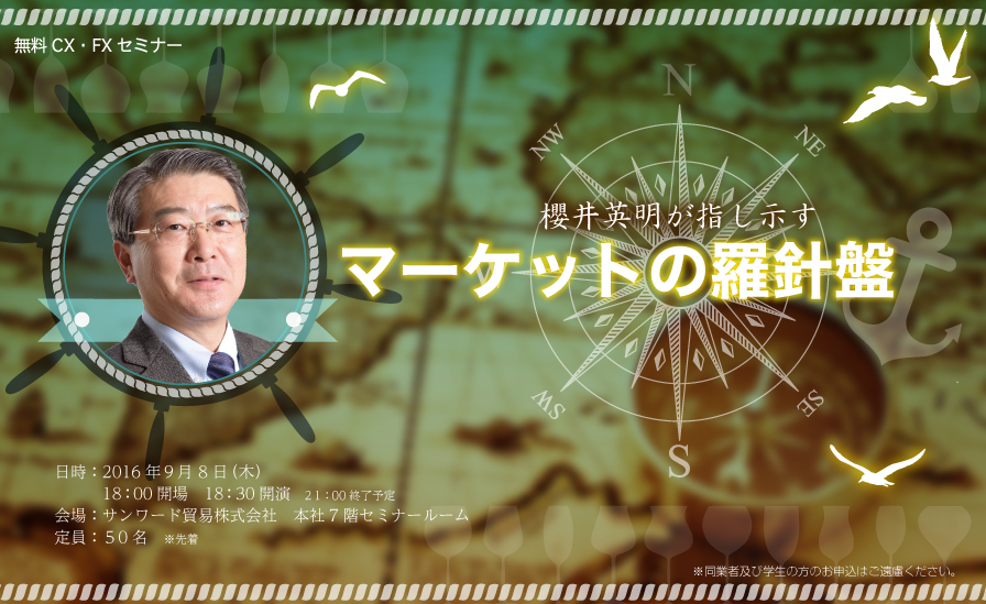 ※本セミナーは弊社サンワード貿易(株)が扱う商品先物取引及び取引所為替証拠金取引(くりっく365)の契約締結の勧誘を目的として開催しております。※本セミナーは途中退室自由です。※商品先物取引及び取引所為替証拠金取引(くりっく365)は相場変動等により元本を上回る損失が生じるおそれがあります。※本セミナーは、相場の動向や売買による利益を示唆または保証するものではありません。投資に関しての最終判断はあくまでもご自身でご決定ください。※お客様の個人情報は、弊社の業務における調査、情報提供、ご案内に利用し、弊社のプライバシーポリシーに基づき、適切に取り扱いいたします。 ※他の参加者へ対する営業、勧誘行為は一切禁止とさせていただいております。※講演者・講演内容などは都合により予告なく変更する場合がございますので予めご了承ください。※同業者及び学生の方のお申込はご遠慮ください。※本セミナーの録音・動画撮影はご遠慮ください。