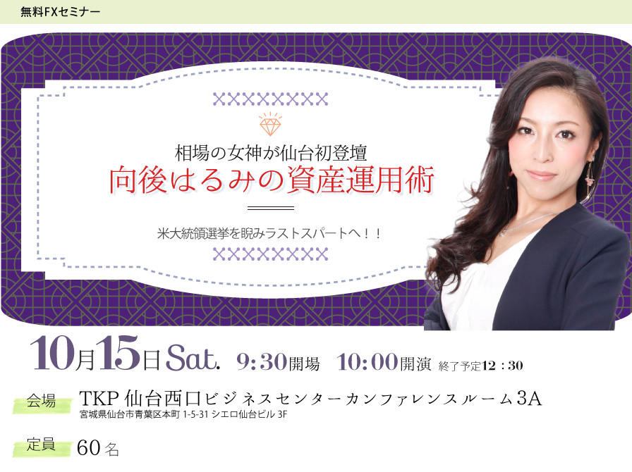※本セミナーは弊社サンワード貿易(株)が扱う取引所為替証拠金取引(くりっく365)の契約締結の勧誘を目的として開催しております。※本セミナーは途中退室自由です。※取引所為替証拠金取引(くりっく365)は相場変動等により元本を上回る損失が生じるおそれがあります。※本セミナーは、相場の動向や売買による利益を示唆または保証するものではありません。投資に関しての最終判断はあくまでもご自身でご決定ください。※お客様の個人情報は、弊社の業務における調査、情報提供、ご案内に利用し、弊社のプライバシーポリシーに基づき、適切に取り扱いいたします。 ※他の参加者へ対する営業、勧誘行為は一切禁止とさせていただいております。※講演者・講演内容などは都合により予告なく変更する場合がございますので予めご了承ください。※同業者及び学生の方のお申込はご遠慮ください。※本セミナーの録音・動画撮影はご遠慮ください。