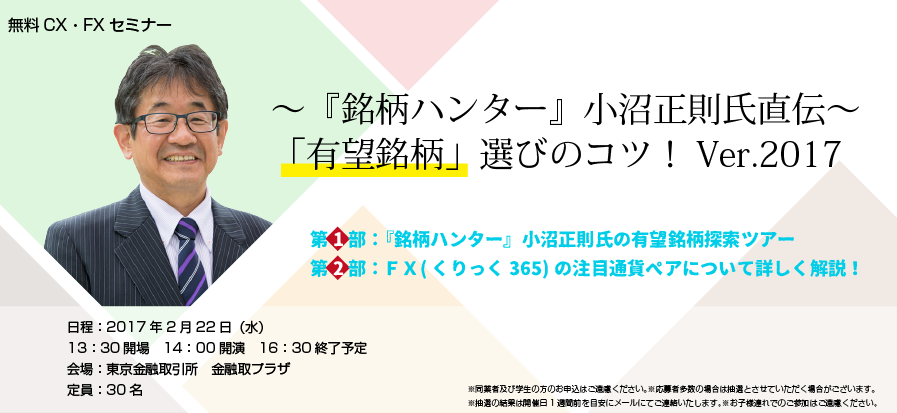 2017年の金融マーケットの行方が予想しにくい中、銘柄選びに定評のある『銘柄ハンター』こと小沼氏に、株式市場の動向や今後の注目銘柄などについて語っていただきます!
